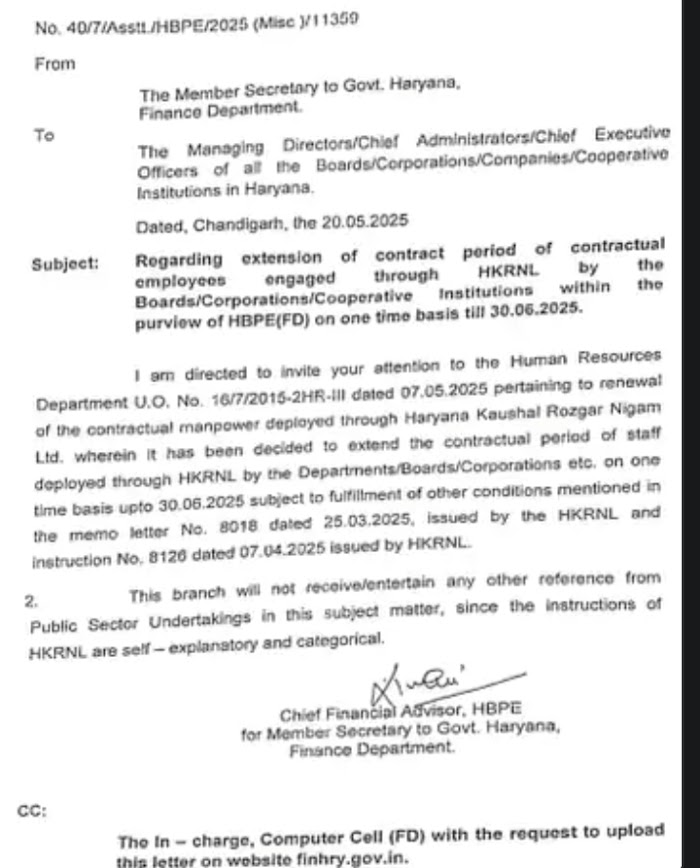 सचिव कार्यालय द्वारा एक आधिकारिक पत्र भी जारी किया गया है, जिसमें यह स्पष्ट किया गया है कि अनुबंध विस्तार के लिए 25 मार्च 2025 को HKRN द्वारा जारी शर्तों को